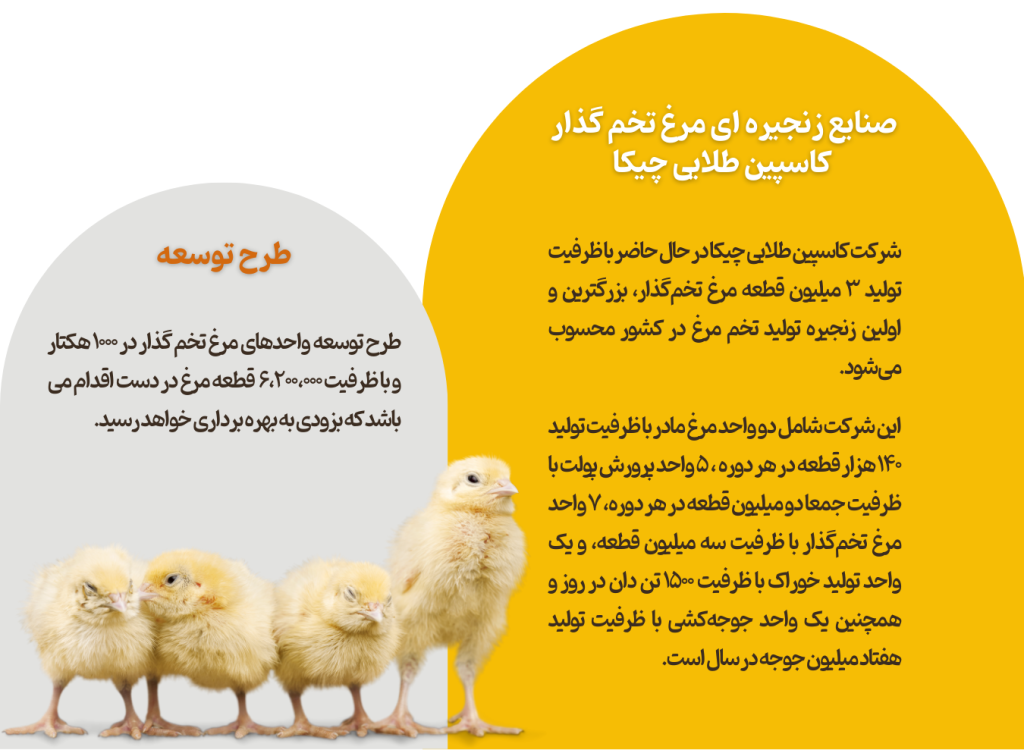 شرکت کاسپین طلائی چیکا از انتهای سال ۱۳۸۳ کار در زمینه تولید تخم مرغ خوراکی را با اجاره یک واحد بیست و سه هزار قطعه ای آغاز نموده به طوری که تا پایان سال ۱۳۸۷ به دو میلیون مرغ تخم گذار در واحدهای تولیدی تحت نظر خود در استان های گلستان، قزوین، البرز و مرکزی رسیده است.